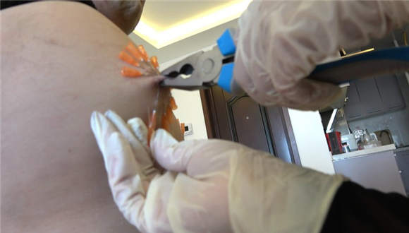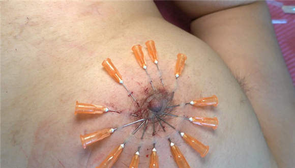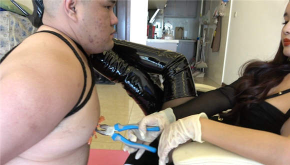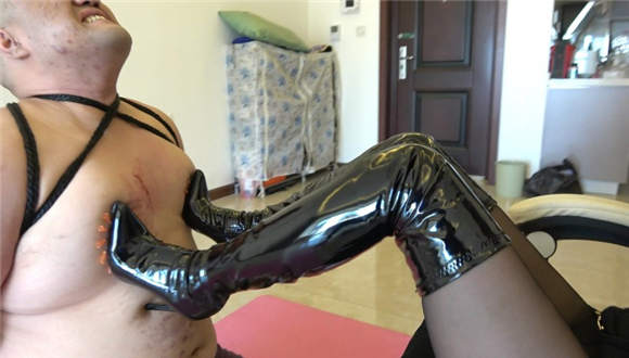 针头胸口狠划,高跟踩划痕,乳头穿刺,长靴踹针头,钳子夹乳头,长靴全体重踩踏穿刺针头,单脚狠剁穿刺乳头,钳子拔牙贱狗疼晕,圣水浇醒贱狗,贱狗痛苦不堪。