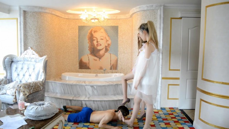 简介:萱萱、欣欣两位主人(半透明露肩纱裙)在户外散步回来,用小m擦鞋、舔鞋;又让小m躺在沙发底,四只脚放在他脸上蹂躏、强迫闻丝袜脚的味道;又脱掉丝袜,蒙住m双眼,通过闻脚分辨脚的主人,答对了奖励脚踩碎的零食、答错了鞭子伺候哈哈;后来两位主人嬉笑着玩游戏,小m在脚下舔脚伺候