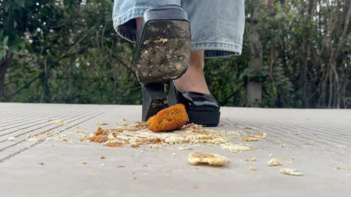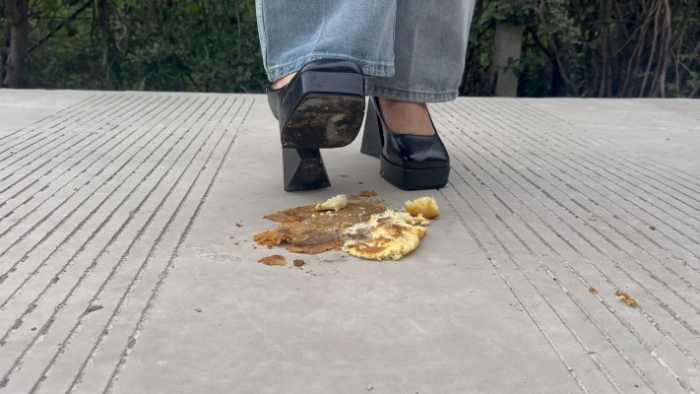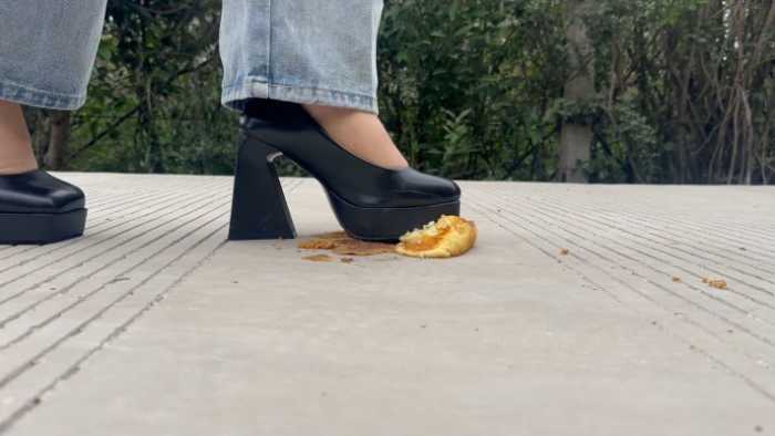 复古超高跟10cm玛丽珍鞋在户外踩了6个蛋糕,每一个蛋糕都对应不同的踩踏脚法,温柔的,无意识的,凶狠剁踩的,等等都有,特写与中远景切换拍摄;