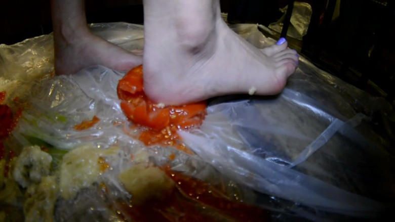 ②用鞋跟刺水果→脱鞋赤足踩烂水果